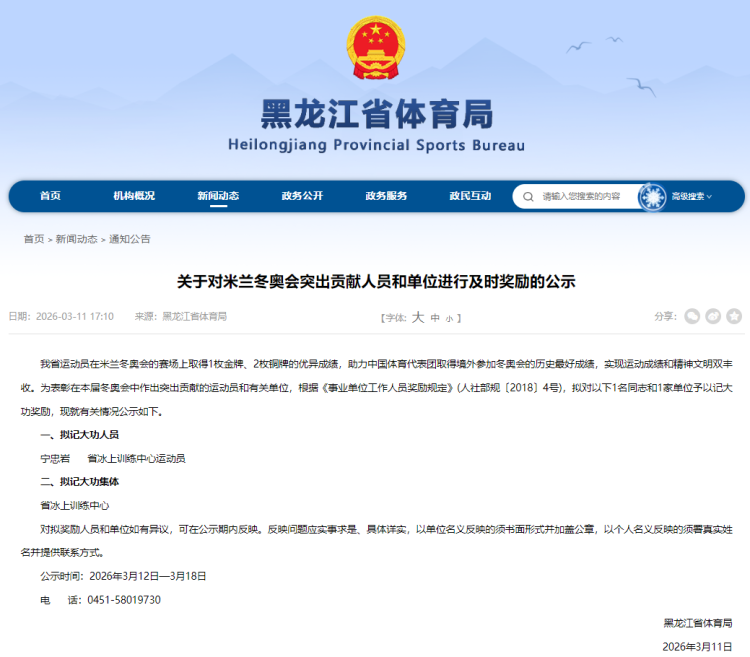 公示称,黑龙江省率领员在米兰冬奥会的赛场上获取1枚金牌、2枚铜牌的优异获利,助力中国体育代表团获取境外插足冬奥会的历史最佳获利,收尾率领获利和精神文静双丰充。为赏赐在本届冬奥会中作出卓越孝敬的率领员和相干单元,左证《业绩单元责任主谈主员奖励限定》(东谈主社部规〔2018〕4号),拟对以下1名同道和1家单元给予记大功奖励,现就相干情况公示如下。公示本领为2026年3月12日至3月18日。