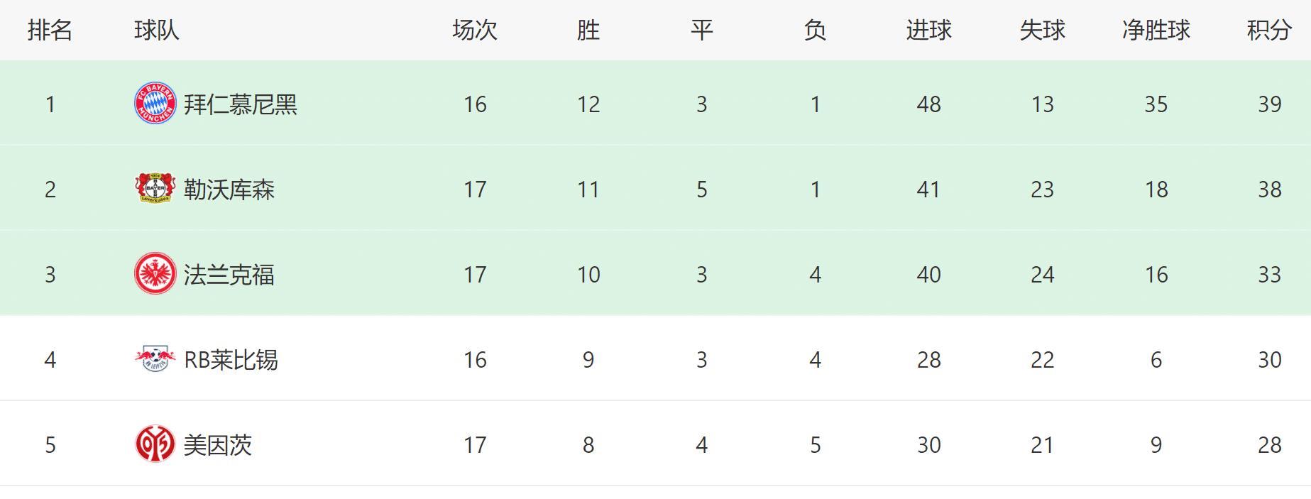 最新积分榜,勒沃库森依靠一波联赛7连胜的战绩,积38分坐稳第二的位置,何况多赛一轮距离领头羊拜仁只差1分,看到了反超但愿,因为联赛还有17轮的比赛,只差一分变数很大,勒沃库森随时都有可能高出拜仁登上榜首。
