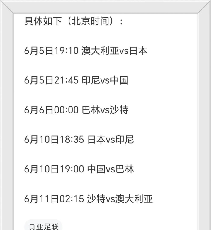 亚足联依然精采晓谕了临了两轮比赛的时刻,国足与印尼队的比赛将于北京时刻6月5日晚21点45分进行。