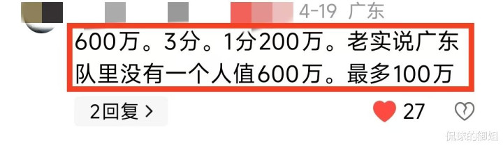 此役,广东队只消3名球员得分上双,吉伦沃特包揽了球队三分之一的火力,他一东谈主就轰下36分。徐杰拿到12分,伯克也有15分进账。重心就是队长胡明轩,行为球队独一的顶薪跟魁首,全场比赛胡明轩投篮4中1,只拿到了3分4篮板。赛后,他的推崇致使被广东球迷诟病,一位广东网友写谈:600万,3分,1东谈主200万!憨厚说广东队里莫得一个东谈主值600万,最多100万。如下图: