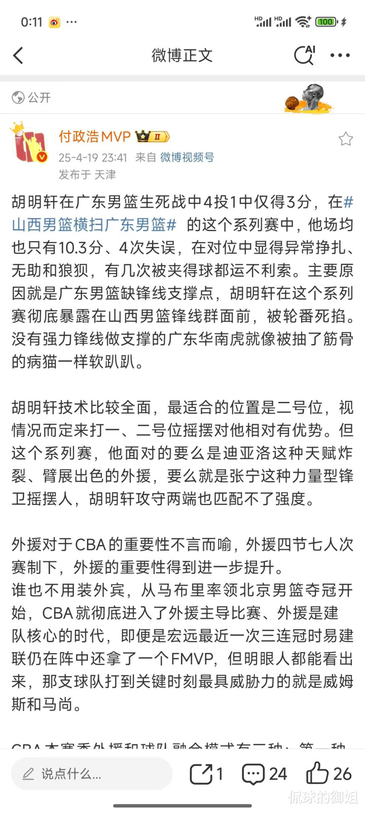 不外,专科的事交给专科的东谈主评判,媒体名嘴付政浩长文力挺胡明轩,他原文写谈:胡明轩在广东男篮生苦战中4投1中仅得3分,在山西男篮横扫广东男篮#的这个系列赛中,他场均也只消10.3分、4次舛讹,在对位中显得相等抵御、无助和莫名,有几次被夹得球齐运不利索。主要原因就是广东男篮缺锋线赈济点,胡明轩在这个系列赛透顶自大在山西男篮锋线群眼前,被次序死掐。莫得强力锋线作念赈济的广东华南虎就像被抽了筋骨的病猫相似软趴趴。