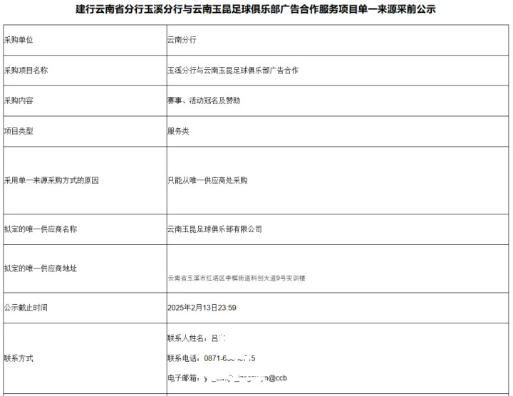 与此同期,另一家银行——中国成立银行2月13日也裸露了“建行云南省分行玉溪分行与云南玉昆足球俱乐部告白合营作事款式单一来源采前公示”,采购本体是“赛事、行径冠名及扶持”,拟定的惟一供应商是“云南玉昆足球俱乐部”。